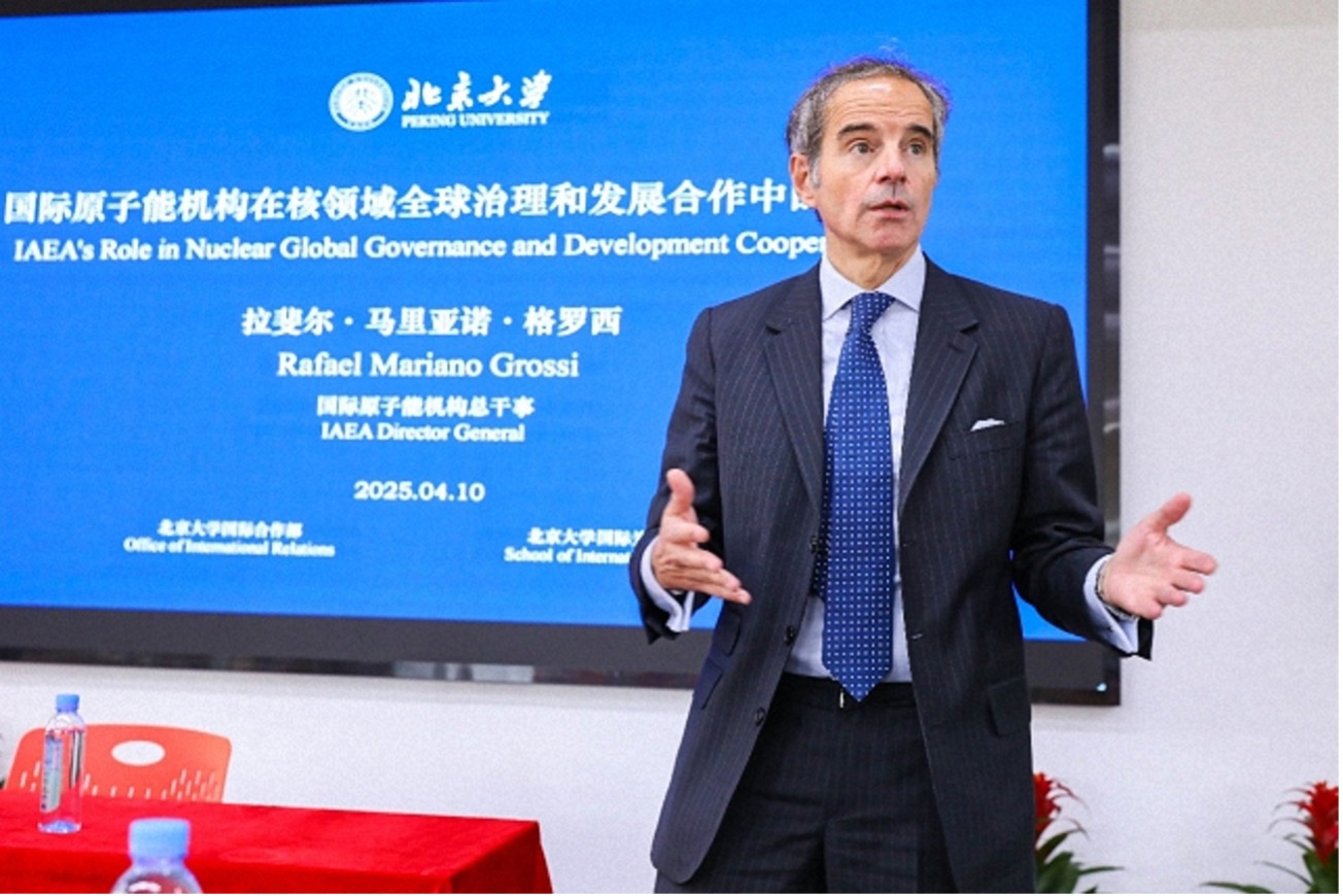 On April 10, 2025, Mr. Rafael Mariano Grossi, Director General of the International Atomic Energy Agency (IAEA), visited the School of International Studies (SIS) at Peking University. Professor Tang Shiqi, Dean of the School, met with the distinguished guests. The delegation included IAEA Deputy Director General Liu Hua, Chief of the Director General’s Office Jacek Andrzej Byllica, Special Assistant to the Director General for Human Resources Mariela Adriana Forgante, Director of the Technical Cooperation Department Deng Ge, and Director of the Nuclear Energy Department Huang Wei. Also present were Huang Ping, Secretary-General of China’s National Atomic Energy Agency, Division Director Gu Shaogang, and Zhang Haibin, Vice Dean of the School of International Studies.