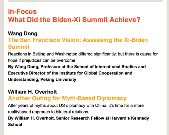 In the other feature article, Overholt argues that U.S. policy toward China has long been shaped by unrealistic “myths” about what diplomacy with China can or should achieve. Such myth-driven policies have persisted under both Trump and Biden. He contends that the Biden administration’s attempt to suppress China’s technological rise, while abandoning commitments on Taiwan, is not “de-risking” but “up-risking.” While American politicians may mislead voters by claiming tariffs protect jobs, American businesses face the reality of job losses. The San Francisco Summit, particularly Xi’s meeting with U.S. business leaders, brought some hope for the return of reality-based thinking in American politics.