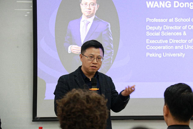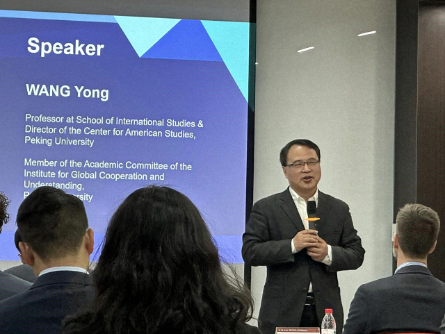 Prof. Wang Yong, Professor at SIS, Director of the Center for American Studies, and Academic Committee Member of the Research Base for Sino-Foreign Humanities Exchange, served as the keynote speaker. He began by sharing his personal story of over 40 years of friendship with American classmates, encouraging students to voice their concerns and perspectives on international affairs.