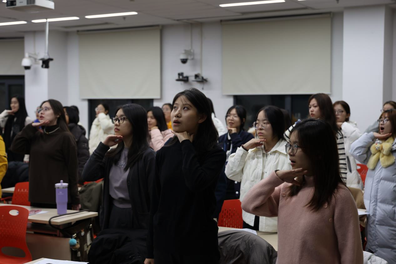 “Dreaming back to that youth, persevering again and again”—a lyric repeatedly sung, and the truest portrait of rehearsal. Lead rehearsal coach Senior Student Yang Jieyu began with fundamental vocal exercises, guiding everyone patiently from the basics. From diaphragmatic breathing and breath control to vocal placement and scale warm-ups, the sounds in the classroom gradually grew from tentative to full and resonant.